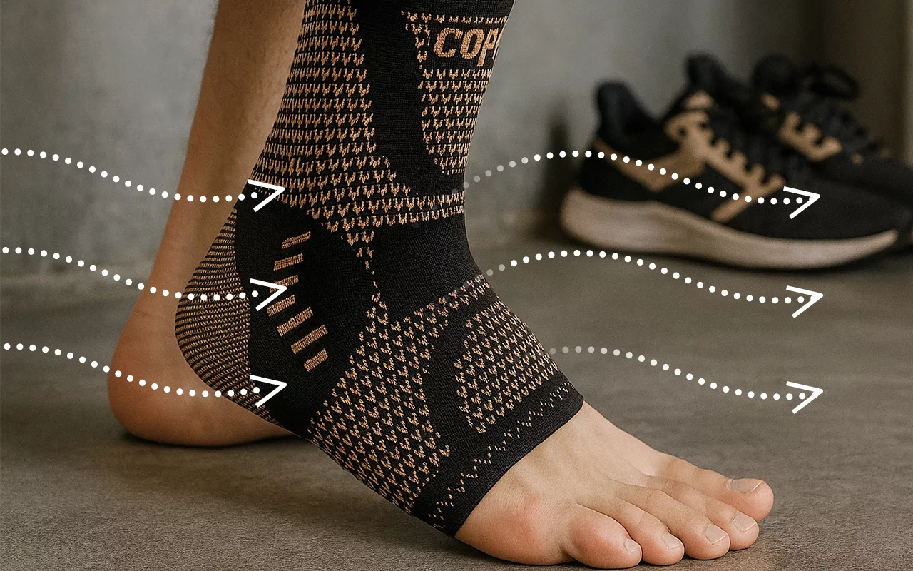 Stof met koper zorgt ervoor dat je voeten de hele dag droog en fris blijven. Voorkomt onaangename geurtjes en laat de huid gemakkelijk ademen.