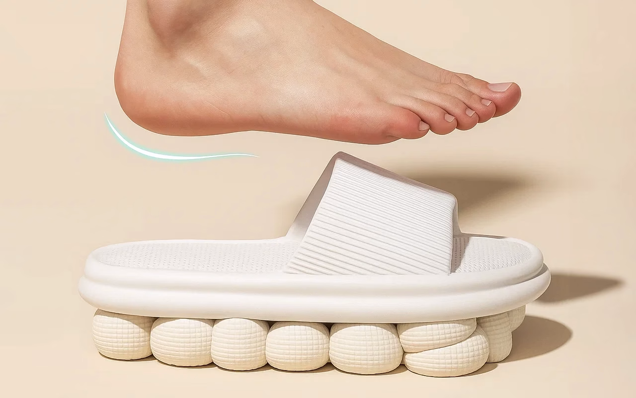 De pantoffels omsluiten mijn voeten zachtjes. Ik trek ze graag ’s ochtends aan omdat de demping zo ontspannend aanvoelt. Nooit meer uitglijden op onze keukentegels!