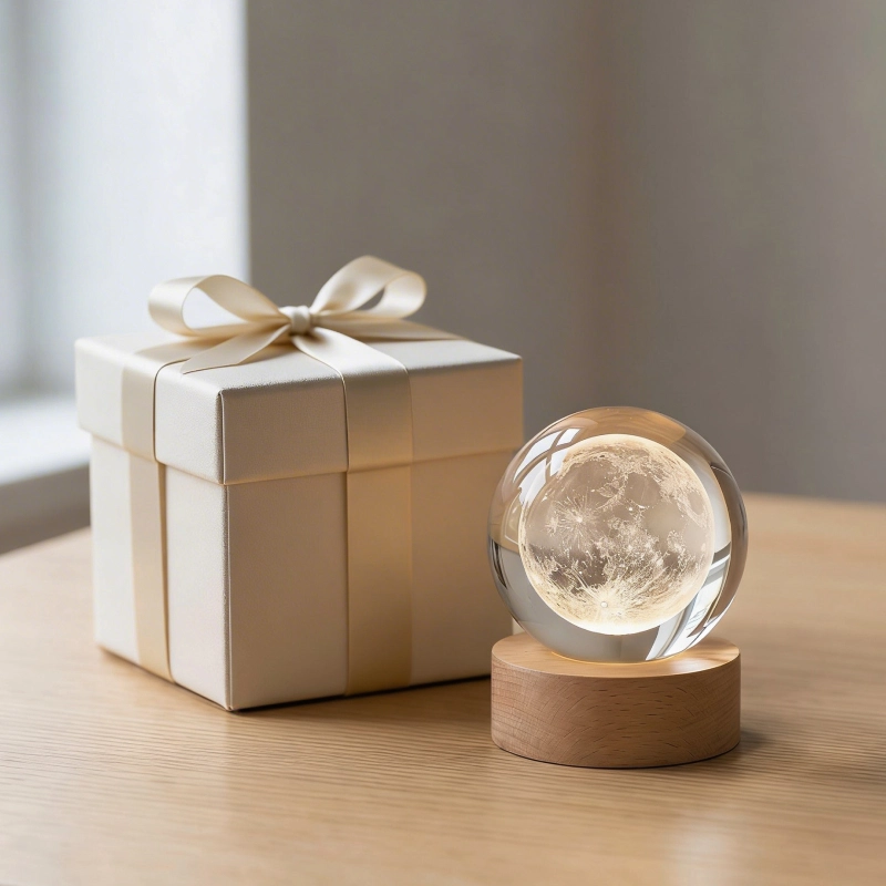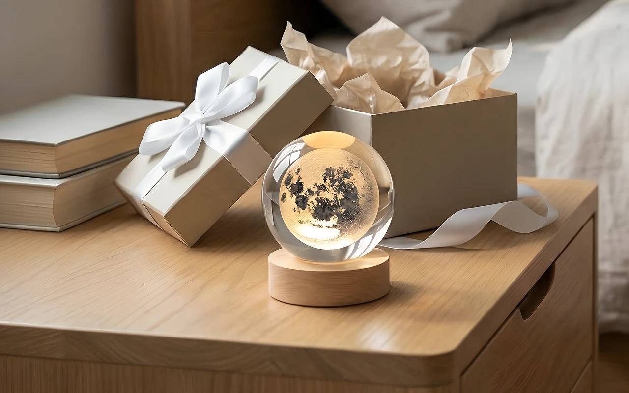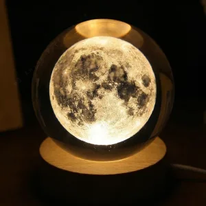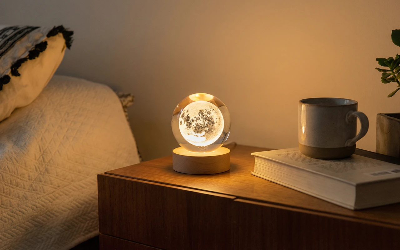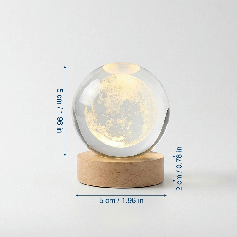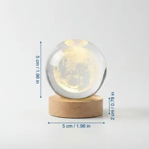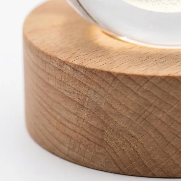 De kristallen lamp staat chique op mijn nachtkastje. De houten voet voelt stevig aan en de bol zelf heeft van die geweldige kleine galaxydetails.