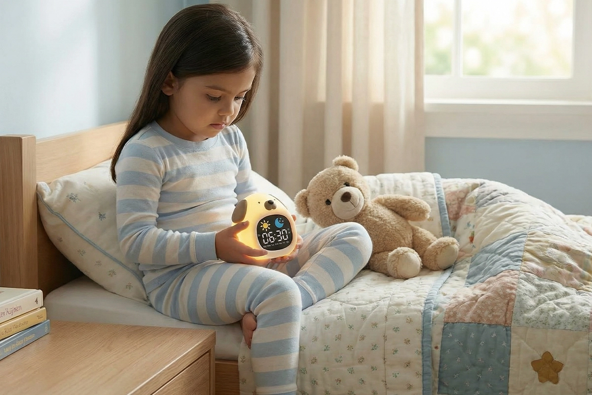 Mijn dochter kroop vroeger elke nacht in ons bed. Met dit klokje dat zacht gloeit, voelt ze zich veilig en blijft ze echt in haar eigen kamer.