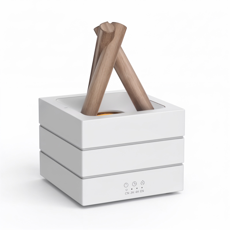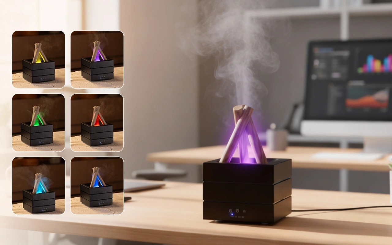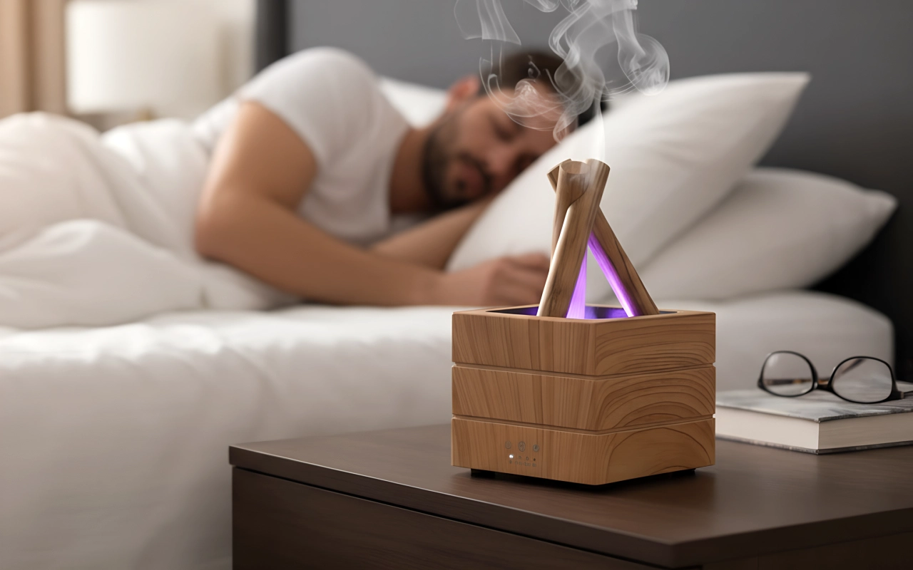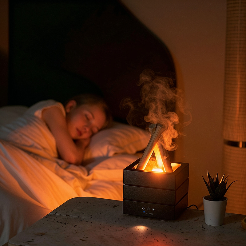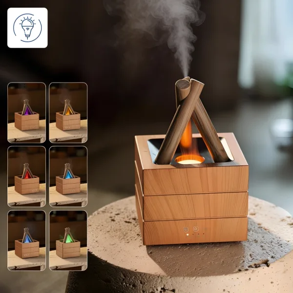 De kampvuur diffuser vult mijn kamer met een zachte mist en de knipperende kleuren helpen me elke nacht beter slapen. Ik gebruik lavendelolie voor extra rust.