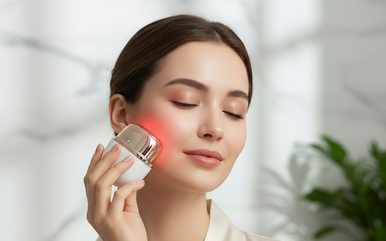 LED-lichten helpen vale tonen te verminderen en verhogen de gloed. Drie kleuren lichttherapie geven in een oogwenk nieuwe uitstraling aan een vermoeid gezicht.