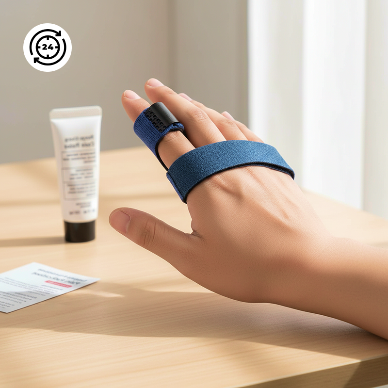 Verstelbare bandjes maken het eenvoudig om de spalk op elke vinger te plaatsen, links of rechts. Geschikt voor volwassenen en kinderen, ideaal voor het hele gezin.