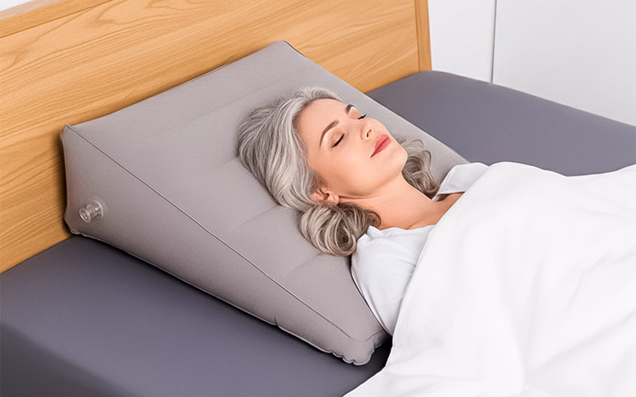 Geniet van verzachtende verlichting tijdens het lezen, slapen of ontspannen thuis. Het compacte ontwerp past gemakkelijk in elke tas voor op reis. Blaas moeiteloos op wanneer nodig, laat vervolgens snel leeglopen en berg hem op. Het Ortorex wigkussen zorgt overal voor comfort.