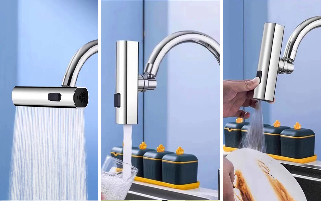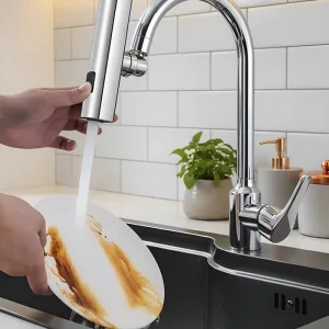 Geen spetters meer! Ik kan van een zachte spoeling voor fruit naar een krachtige straal voor pannen schakelen in één seconde. Zelfs mijn kinderen kunnen het gebruiken.