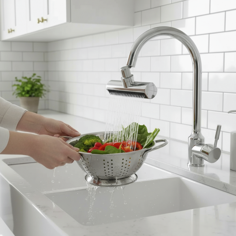 Geen spetters meer! Ik kan van een zachte spoeling voor fruit naar een krachtige straal voor pannen schakelen in één seconde. Zelfs mijn kinderen kunnen het gebruiken.