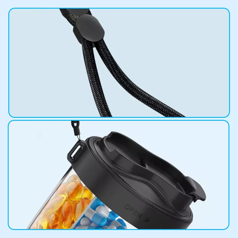 Met het bandje kan ik het doosje aan mijn rugzak hangen. Geen rommel, zelfs de grotere capsules passen erin. Voelt als gemaakt voor op reis.