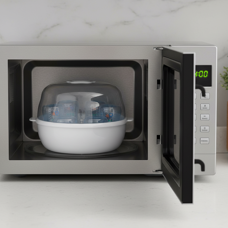 Gewoon vullen met flessen, beetje water erbij, in de magnetron—and klaar. Voelt veilig omdat het BPA-vrij plastic is. Heel blij mee.