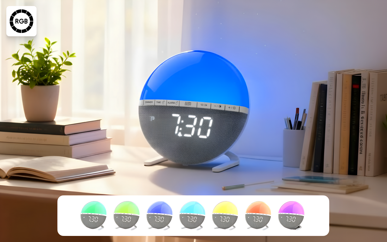 Kies uit zeven rustgevende geluiden of alleen het zonsopganglicht. Tien volumestanden zorgen ervoor dat iedereen zijn perfecte ochtendroutine vindt.