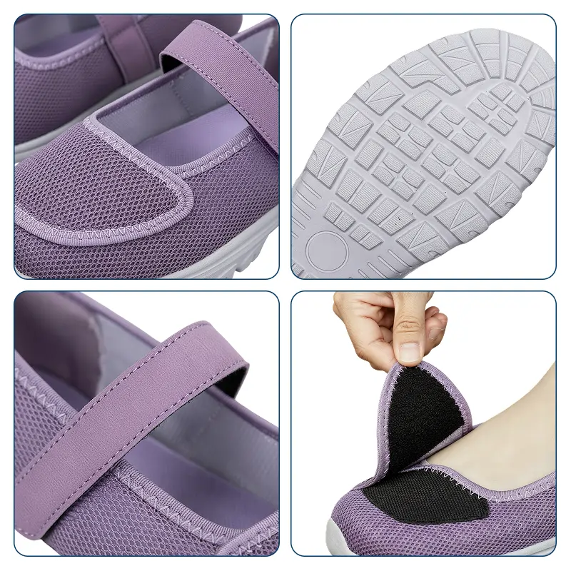 Een eenvoudige sluiting maakt snelle aanpassingen mogelijk wanneer de voet in de loop van de dag van grootte verandert. Dit helpt benauwdheid door zwelling of gevoeligheid te voorkomen.