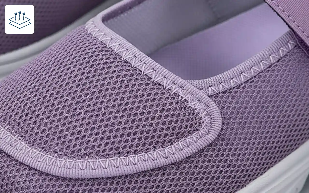 Luchtdoorlatende stof houdt de huid koel en droog en vermindert irritatie. De structuur behoudt stabiliteit terwijl deze zacht aanvoelt tegen de voet.