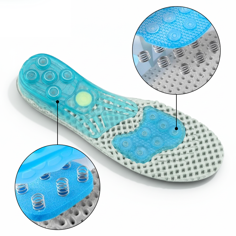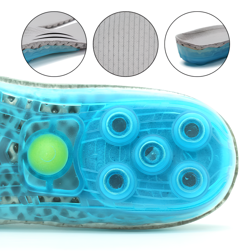 Unieke veertechnologie absorbeert schokken en vermindert spierspanning. Verlichting verspreidt zich snel, zodat pijnlijke hielen en voetenbogen snel kunnen herstellen.