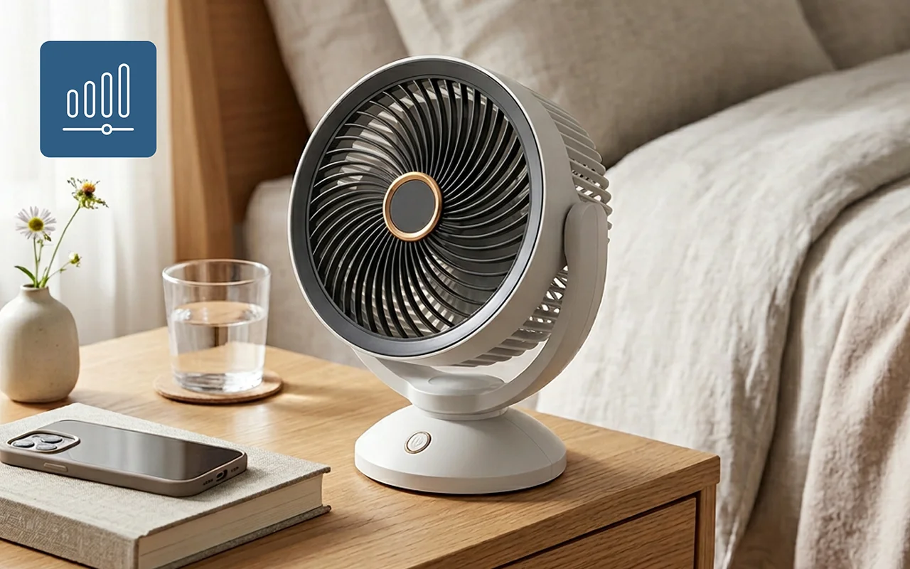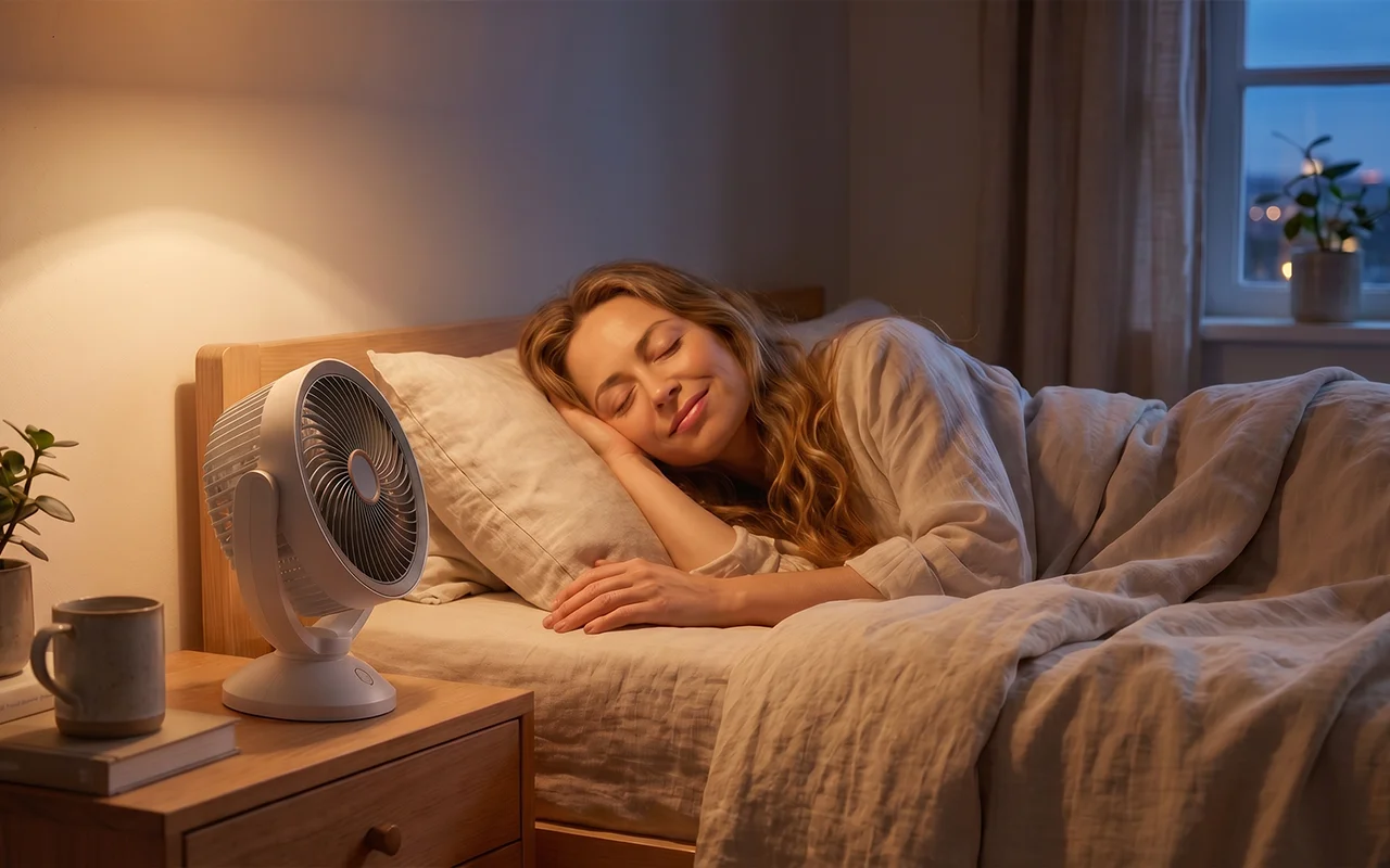 Laag geluid ondersteunt een diepere slaap tijdens warme avonden. Zachte luchtstroom vermindert benauwdheid, waardoor het hoofd zich sneller kan ontspannen.