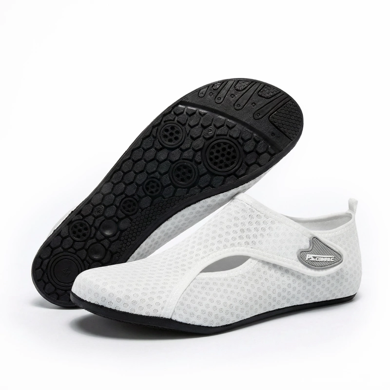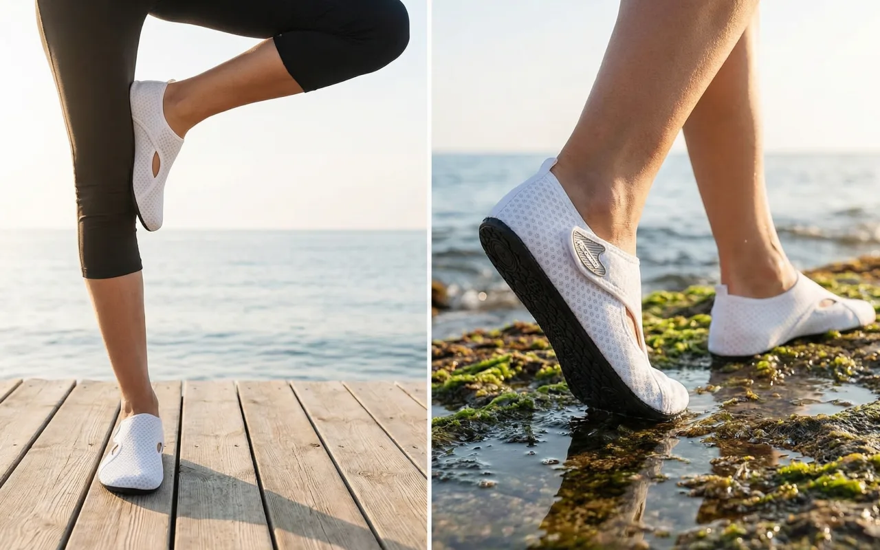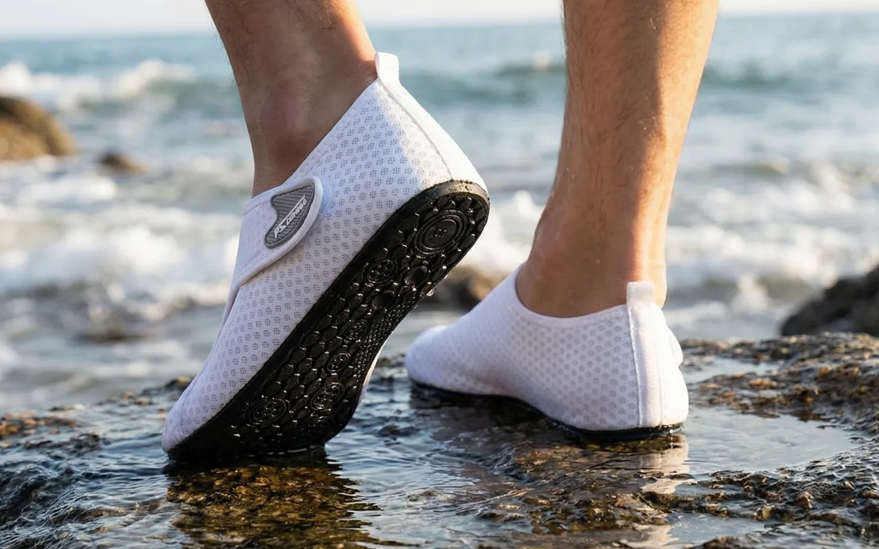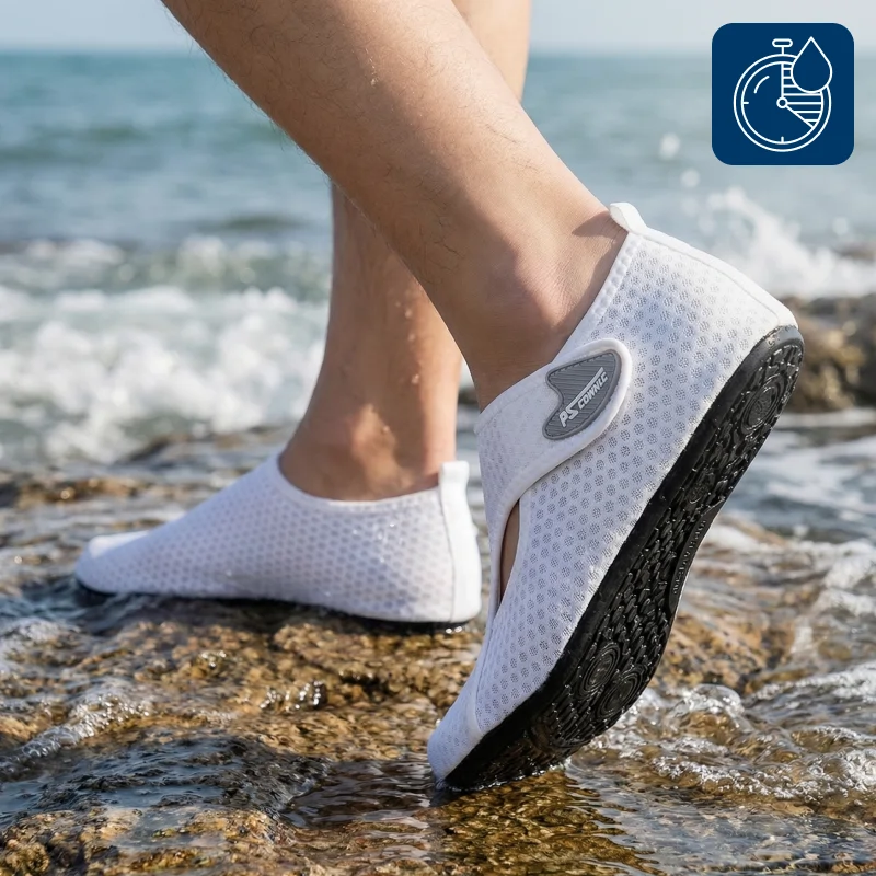 Speciale zolen voorkomen ongewenst uitglijden op rotsen of natte tegels. Voel je veilig waar je ook loopt, van zwembad tot zee.