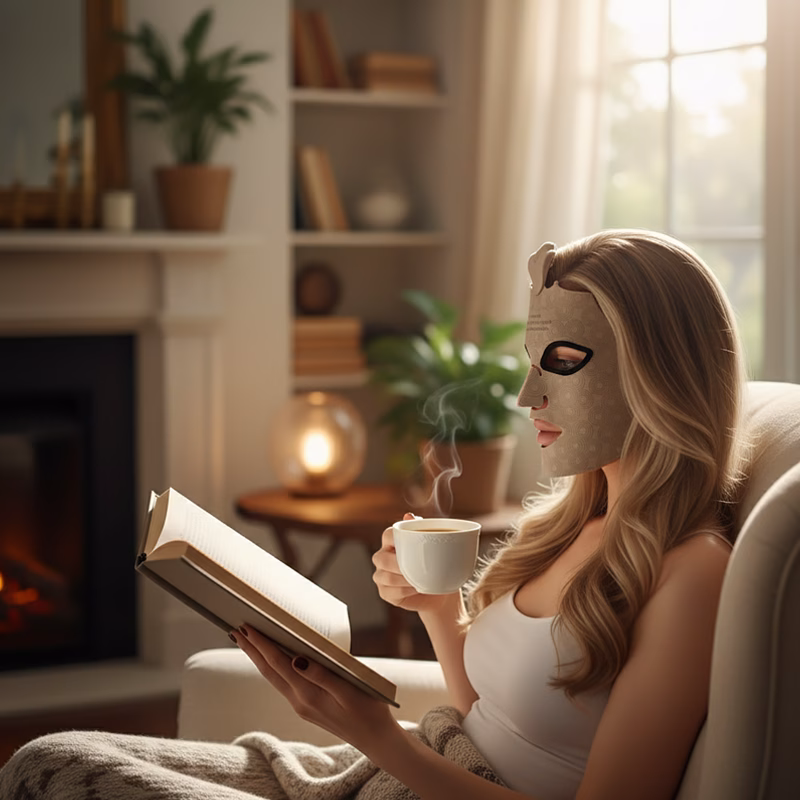 Het LED-masker voelt zo fijn en zacht op mijn gezicht. Ik vind het fijn dat ik kan lezen terwijl ik het draag en mijn huid straalt meer dan ooit.