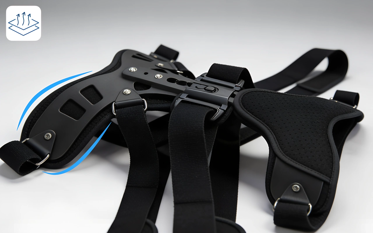 Ademende materialen houden de huid koel en droog. Lichtgewicht platen en steunstaven bieden overal langdurig comfort.