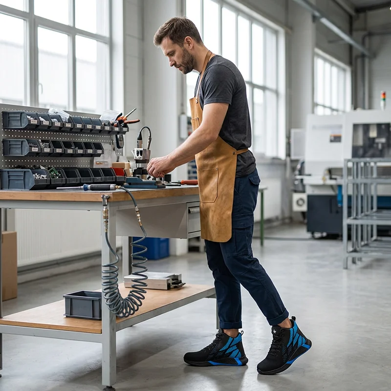 Ik sta uren aan de lopende band en had iets nodig dat vriendelijker is voor mijn gewrichten. Deze sneakers dempen elke stap, de stalen neus geeft gemoedsrust en ze houden het zweet niet vast.