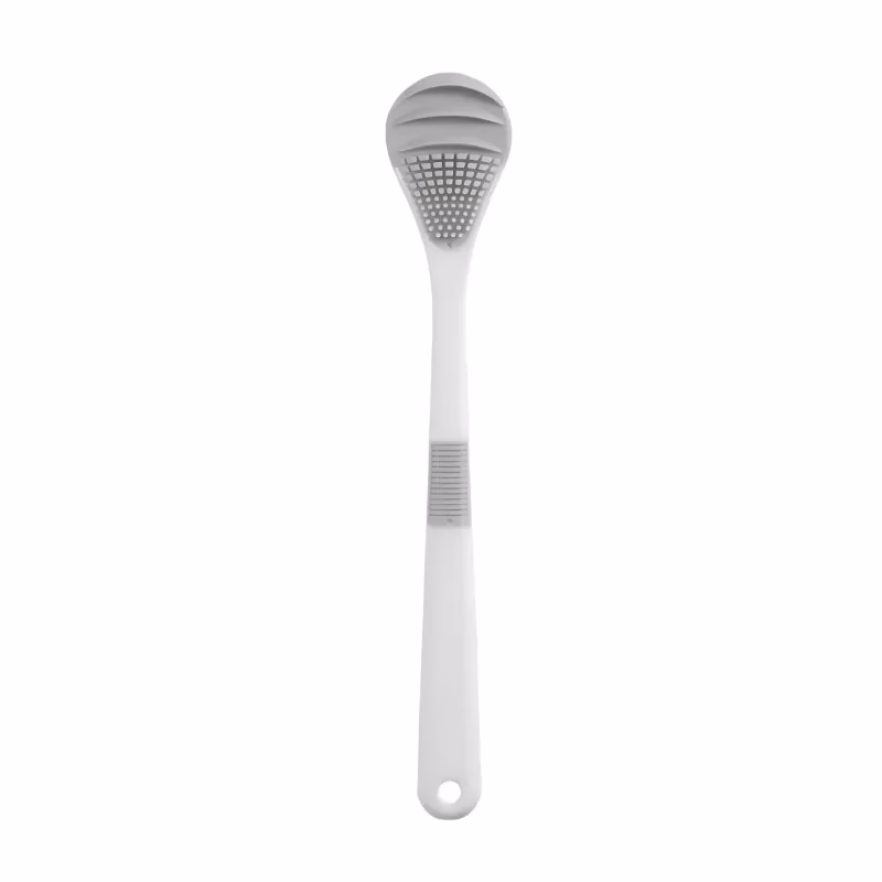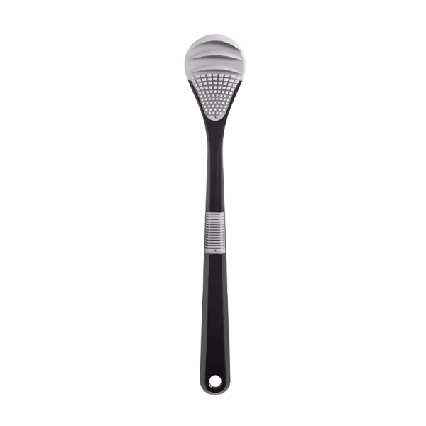 Ik heb andere schrapers geprobeerd, maar dit is de enige waar ik steeds naar teruggrijp. Hij doet geen pijn en het handvat glijdt nooit weg, zelfs niet als ik hem afspoel.
