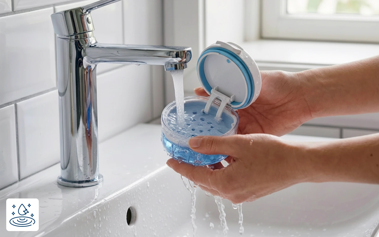 Ik draag de hele tijd een beugel en deze kleine houder zit standaard in mijn werktas. Hij blijft goed dicht, lekt niet en is in een paar seconden schoon te spoelen.