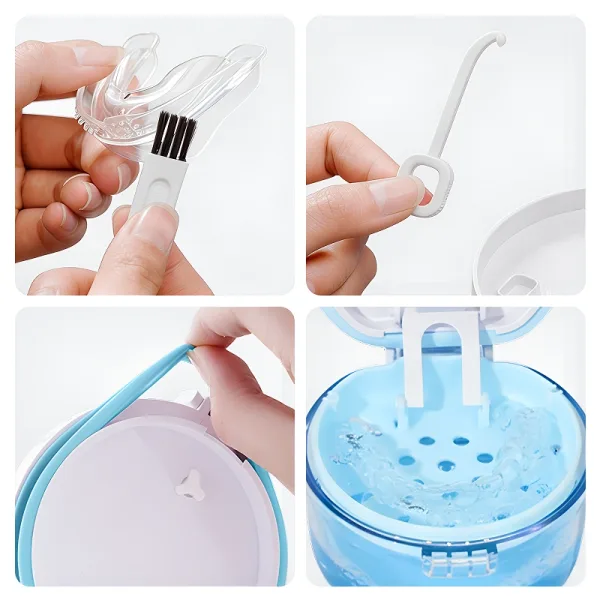Deze beugelhouder gekocht voor mijn nachtelijke bitjes. Lekt helemaal niet, zelfs niet wanneer ik ze laat weken. Past in mijn handtas en is supermakkelijk schoon te maken.