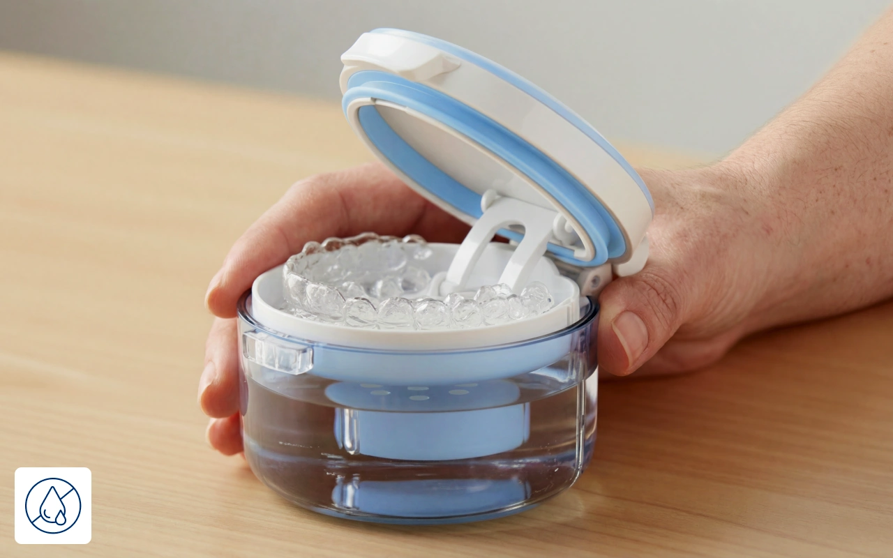 Mijn dochter bewaart haar doorzichtige aligners op school in dit kleine doosje. Het deksel klikt goed vast, geen rare geurtjes, en ik zet het gewoon wekelijks in de vaatwasser.