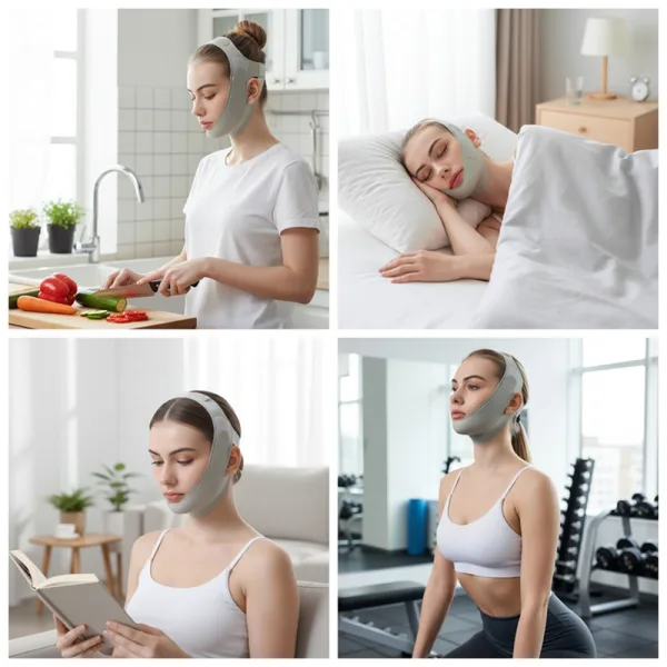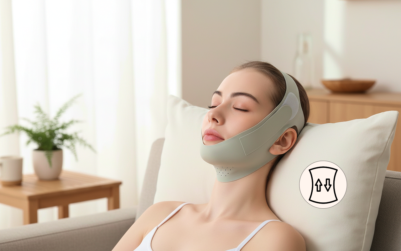 Deze kaakband dragen ’s nachts voelt zacht en licht aan. Ik word elke ochtend wakker en ben blij met het verschil dat ik in mijn gezicht zie.