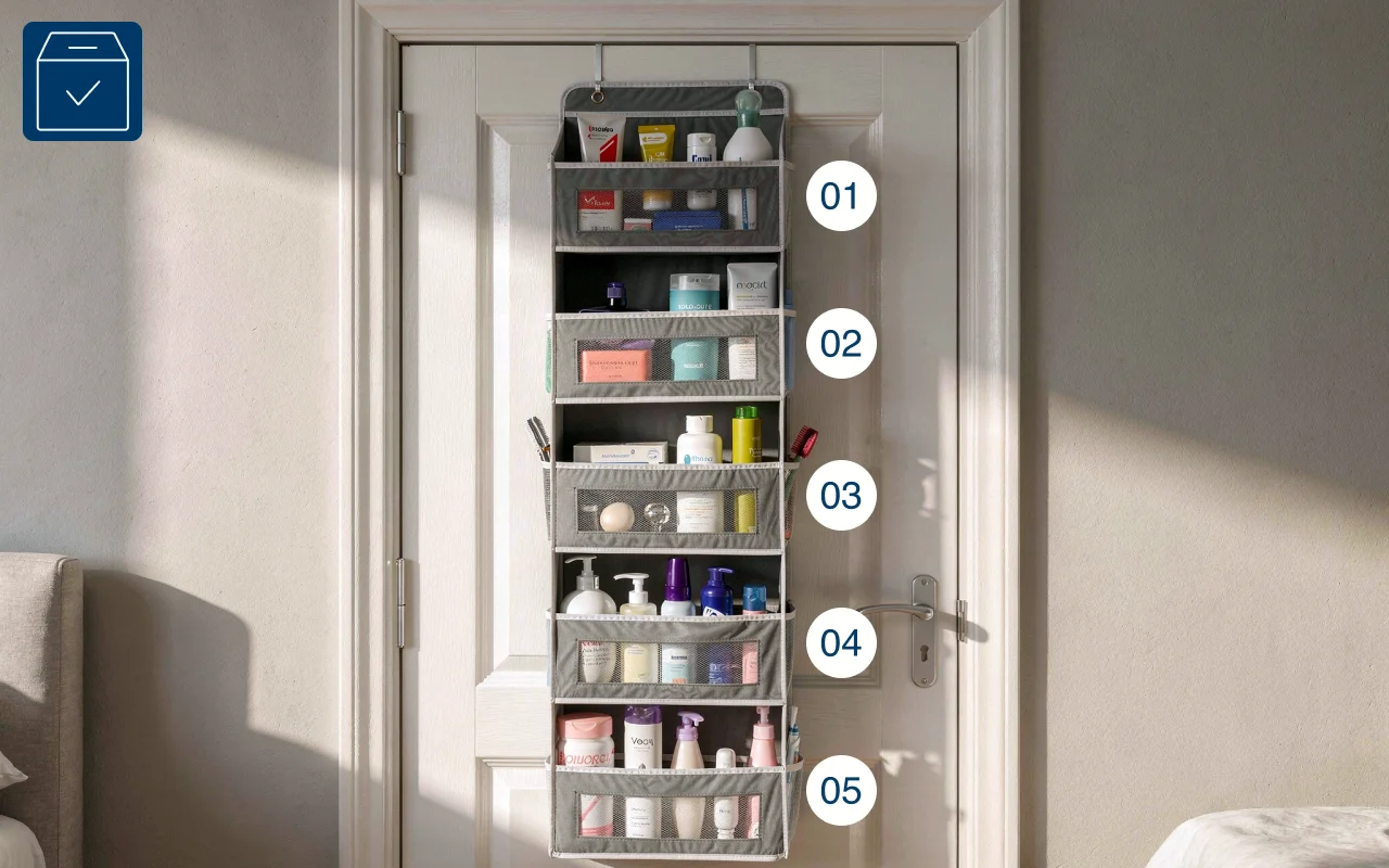 Deze aan mijn slaapkamerdeur gaf me extra opbergruimte. Nu bewaar ik mijn opladers, boeken en schriften daar, zodat mijn bureau netjes blijft.