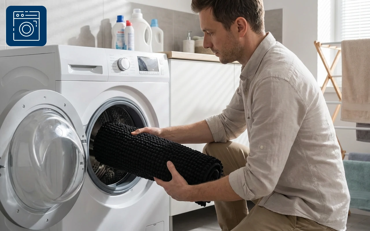 Stop de mat direct in de wasmachine voor een snelle opfrisbeurt. Hij komt er schoon uit en is binnen enkele minuten weer klaar voor gebruik.
