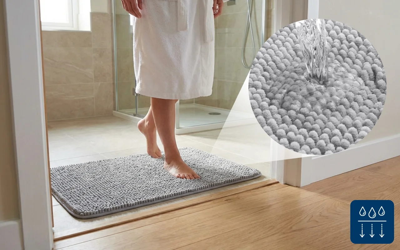 Ik was verrast hoe snel deze mat water opneemt na regenachtige dagen. Hij droogt snel, ruikt nooit muf en voelt altijd zacht aan onder mijn voeten.