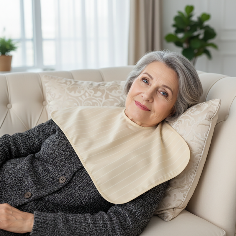 Deze slab houdt mijn shirts droog en vlekkeloos wanneer ik soep eet. Hij voelt zacht aan mijn nek en wordt zelfs na een paar uur nooit irritant.