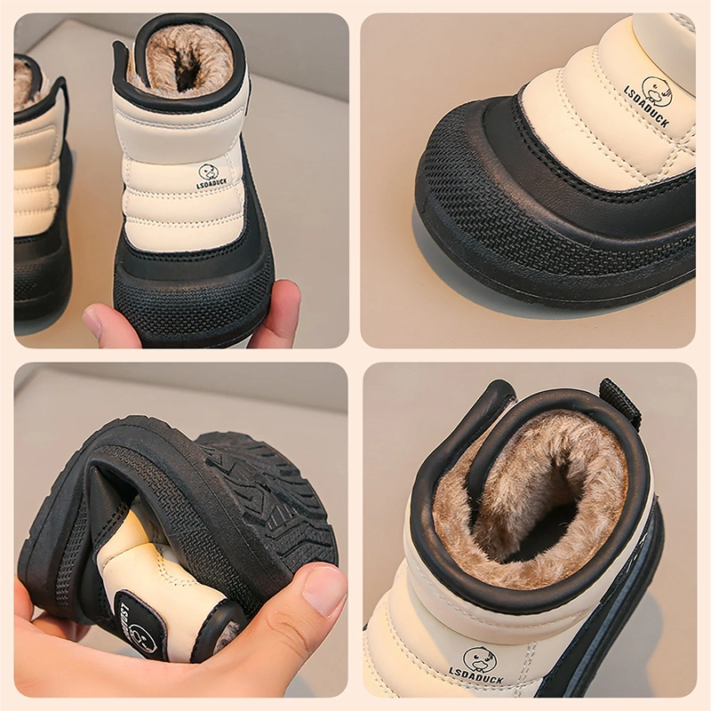 Mijn tweeling droeg deze laarzen in het park door modderige en besneeuwde stukken. Hun voeten werden nooit nat en ze vonden de pluizige binnenkant fijn.