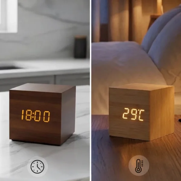 Opstaan is minder vervelend als ik deze klok gebruik. De houtlook past overal bij en de temperatuur checken is handig voordat ik naar school ga.