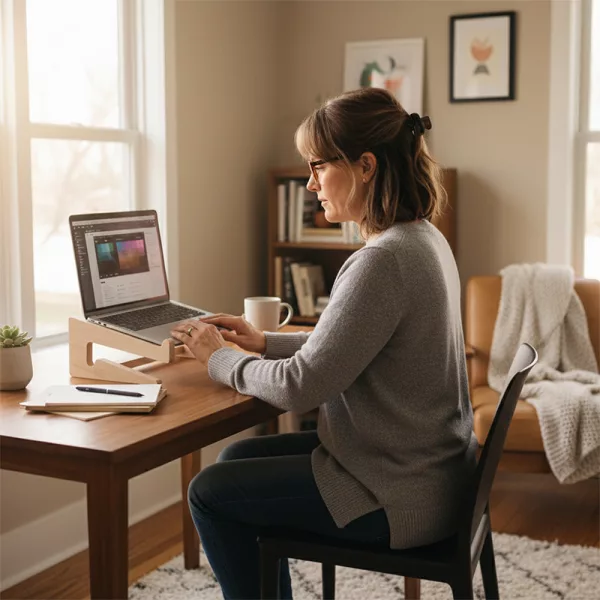 Elke ochtend zit ik bij het raam met mijn koffie en laptop op deze standaard. Het hout voelt warm aan en hij verschuift nooit tijdens het typen.
